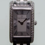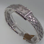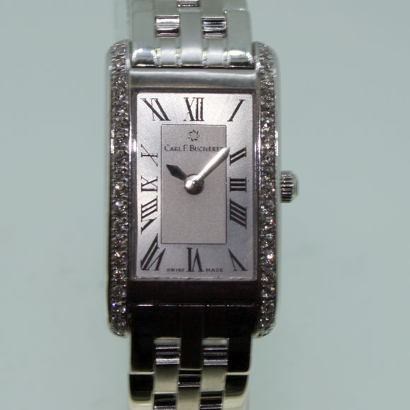 Stylish, 18ct white gold ladies bracelet watch by Carl F Bucherer, with silver coloured dial, Roman numerals, white gold hands and sapphire crystal. The rectangular case has diamonds set on each side (40 in total). It has a quartz movement, and the total weight of the watch is 48 grams. It will fit a small wrist only.